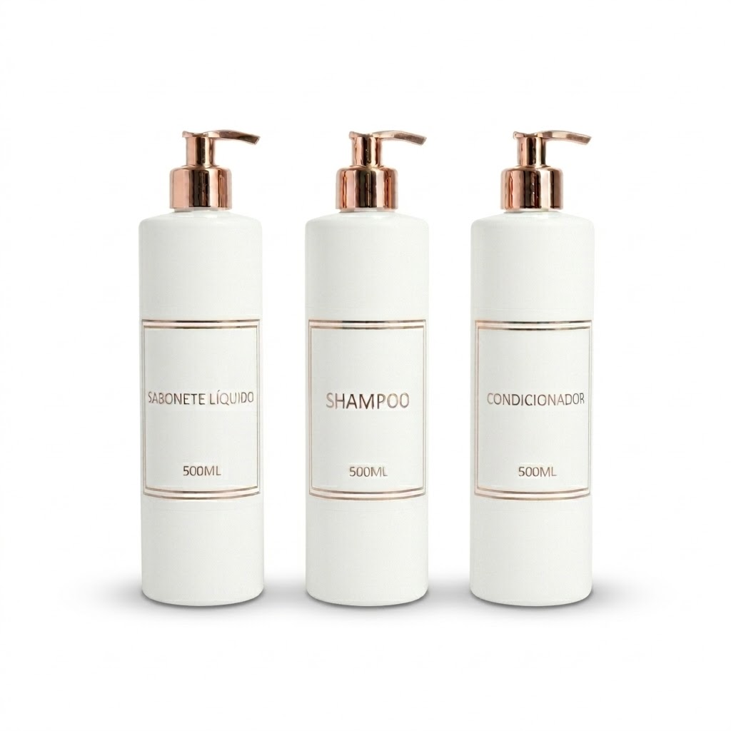 Com um design clean em branco e válvulas em Rose Gold, eles são perfeitos para organizar o box ou a bancada do lavabo, eliminando aquela poluição visual de embalagens variadas.